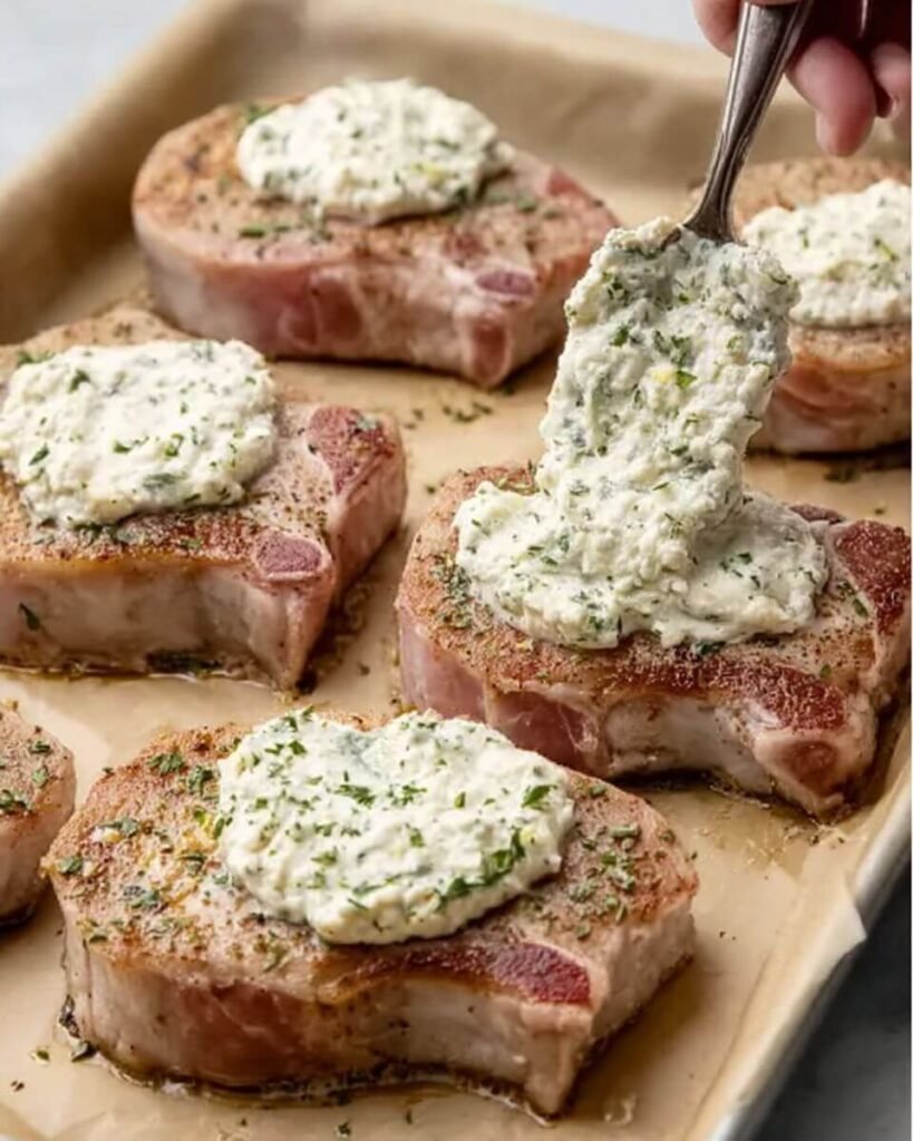 pork chops topped with a creamy herb cheese mixture (similar to a ricotta or garlic-herb spread). Here’s a full, simple