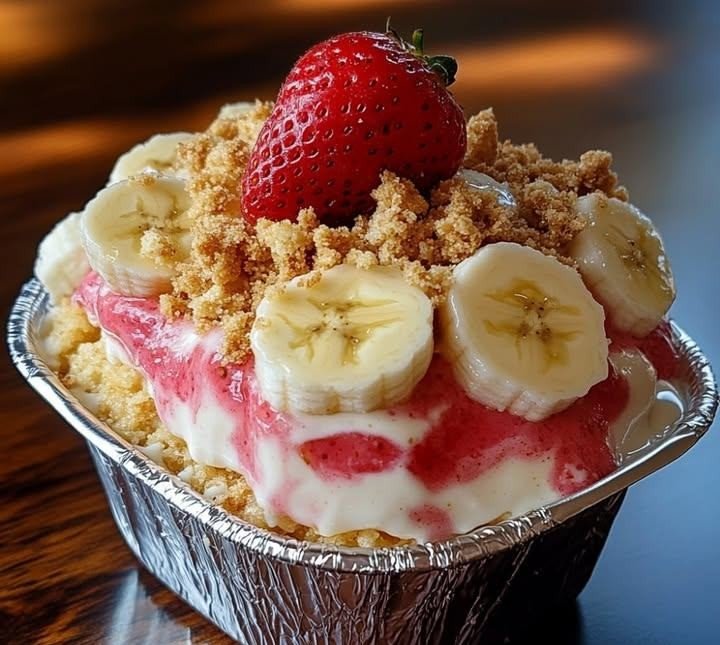 Strawberry Crunch Banana Pudding 🍓🍌 This dessert is a creamy, layered treat combining classic banana pudding with a sweet strawberry