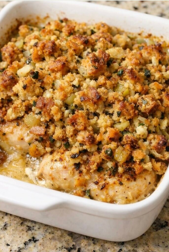baked chicken with a crispy breadcrumb stuffing topping (similar to a stuffing-topped chicken casserole). Here’s a full recipe you can […]