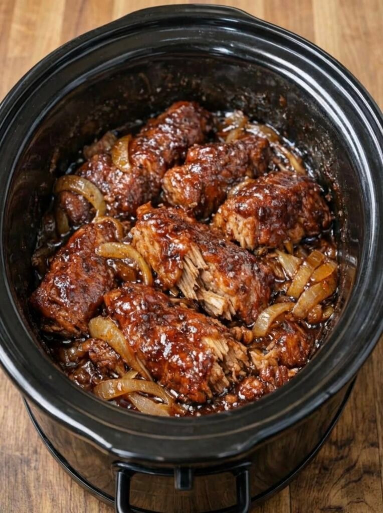 a rich slow-cooker style dish—likely BBQ-style country ribs or braised pork in a sweet-savory sauce with onions. Here’s a full