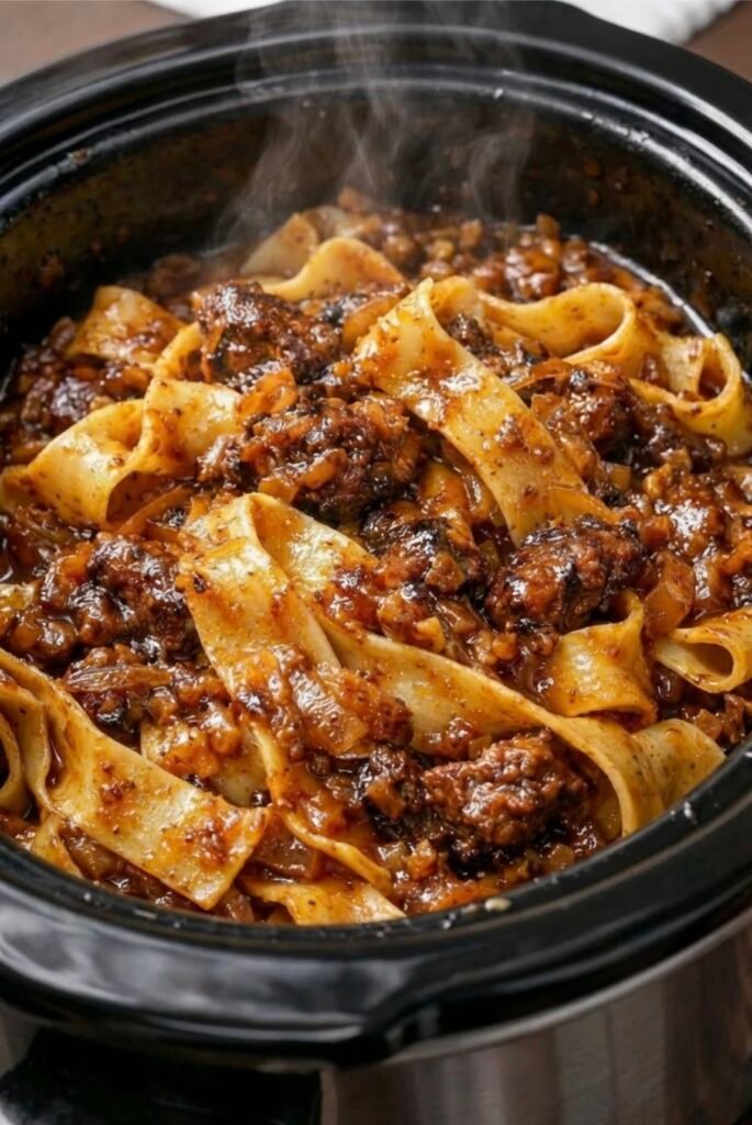 a rich, slow-cooked pasta—very similar to a hearty slow cooker beef ragù with wide noodles (like pappardelle). Here’s a full