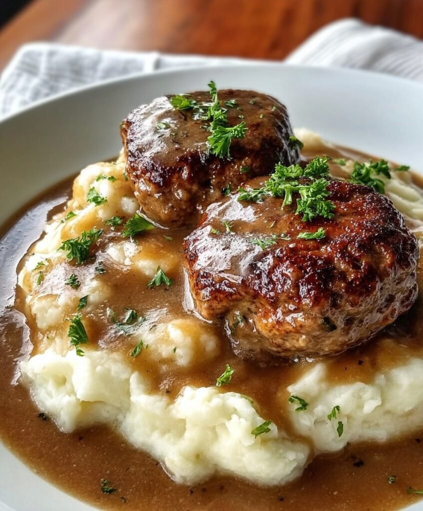 classic Salisbury steak with mashed potatoes and brown gravy—comfort food at its best. Here’s a full, easy-to-follow recipe so you