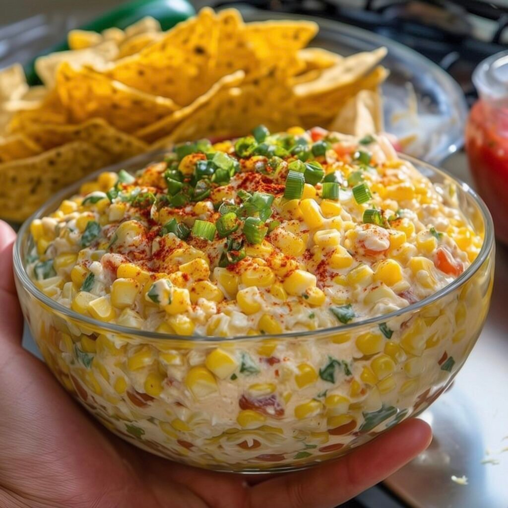 A Creamy Corn Dip (Mexican-style / Party Corn Dip) — rich, slightly spicy, and perfect with tortilla chips 🌽🧀 Here’s