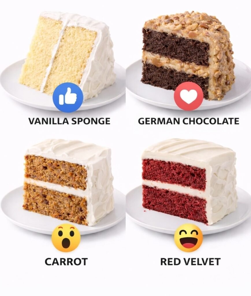 Here are full recipes for all four cakes shown: Vanilla Sponge, German Chocolate, Carrot, and Red Velvet. Each makes two