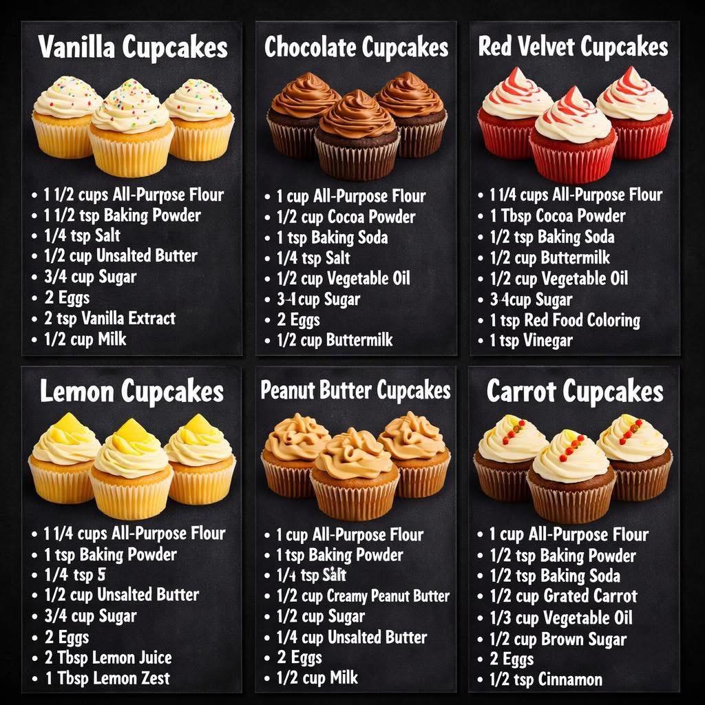 1. Vanilla CupcakesIngredients• 1½ cups All-Purpose Flour• 1½ tsp Baking Powder• ¼ tsp Salt• ½ cup Unsalted Butter (softened)• ¾