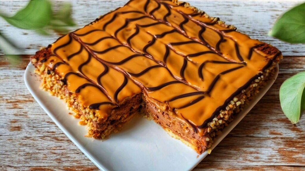 Here’s a close match recipe you can make at home—soft sponge layers, creamy caramel filling, nutty sides, and that glossy