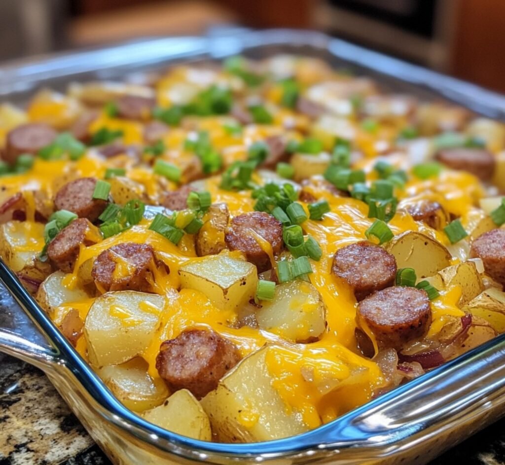 Cheesy Sausage & Potato Bake (a hearty casserole with roasted potatoes, sausage, melted cheddar, and green onions). Here is the