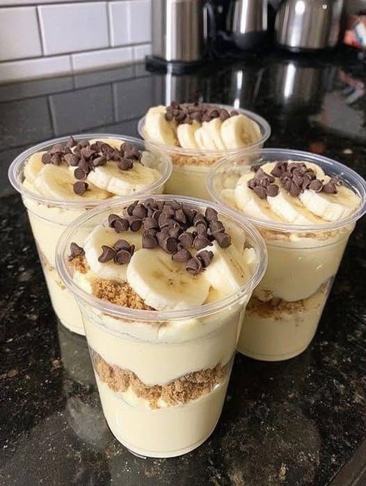 Banana Pudding cups with crushed cookies and chocolate chips. Here is the full creamy homemade recipe ๐ŸŒ๐Ÿฎ Banana Pudding Cups