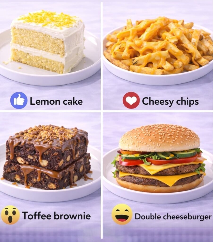 Here are simple full recipes for the four foods : π Lemon Cake, π§ Cheesy Chips, π« Toffee Brownies, and