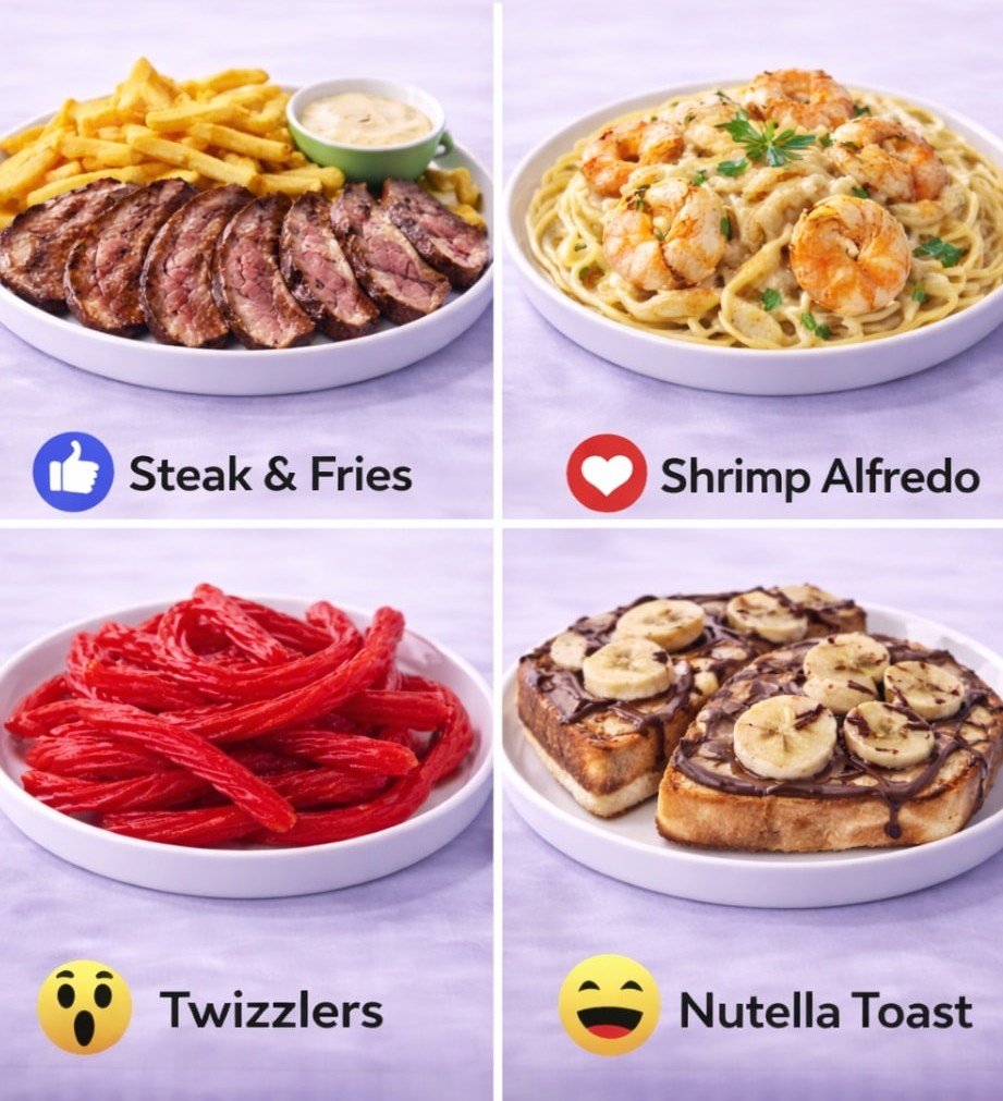 Here are full simple recipes for the foods : π₯© Steak & Fries, π€ Shrimp Alfredo, π Twizzlers-style candy, and