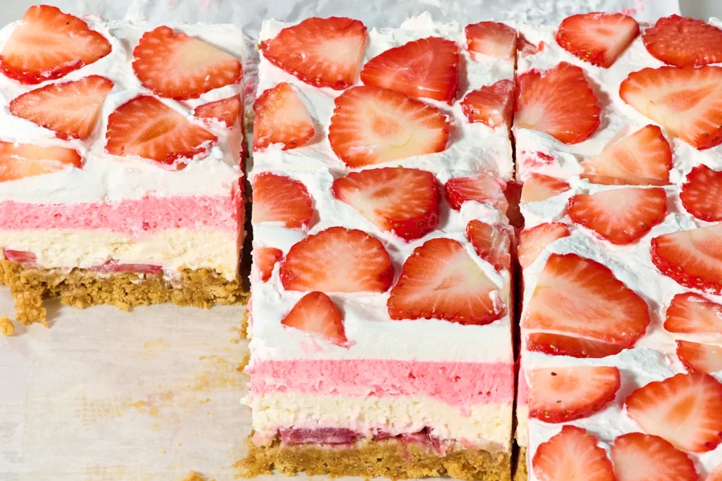 No-Bake Strawberry Delight The Perfect Spring Dessert (Cool, Creamy & Crowd-Pleaser!) 4 This dreamy layered dessert features a buttery graham