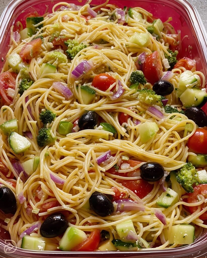 fresh Mediterranean Pasta Salad with spaghetti, crunchy veggies, olives, and a light vinaigrette. Here’s a full, detailed recipe to recreate