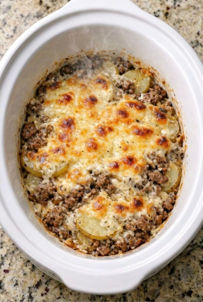 Cheesy Ground Beef & Potato Casserole (Slow Cooker Style) A hearty, comforting meal made with layers of tender potatoes, seasoned