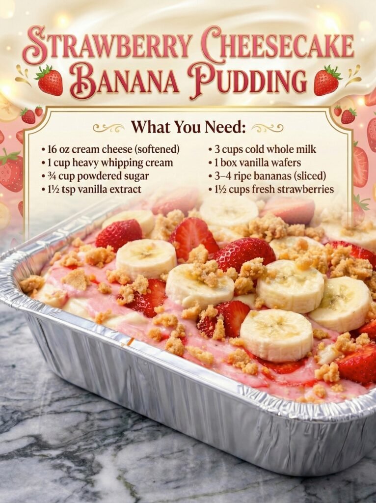 Strawberry Cheesecake Banana Pudding (Creamy, Layered, No-Bake) 4 A luscious, no-bake dessert combining creamy cheesecake pudding, fresh strawberries, bananas, and