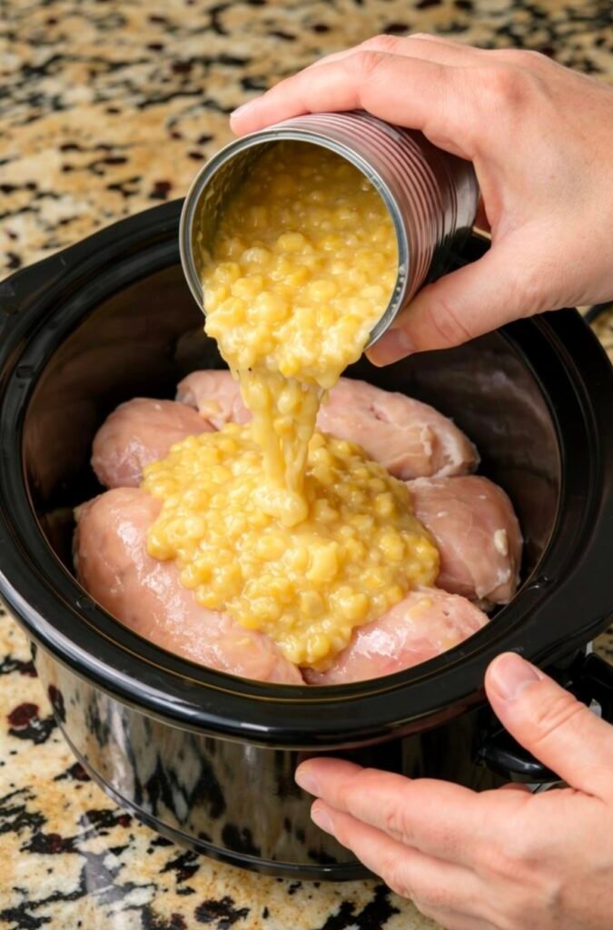๐ Dump Cream-Style Corn Chicken (Easy One-Pan Dinner) Tender chicken breasts baked under a creamy, sweet corn topping โ just