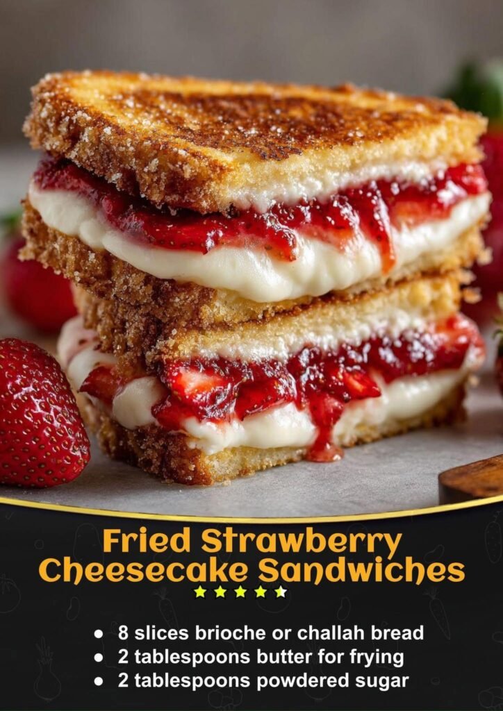 Hereโs a full, bakery-style Fried Strawberry Cheesecake Sandwiches recipe โ crispy outside, creamy inside, and packed with strawberry flavor ๐