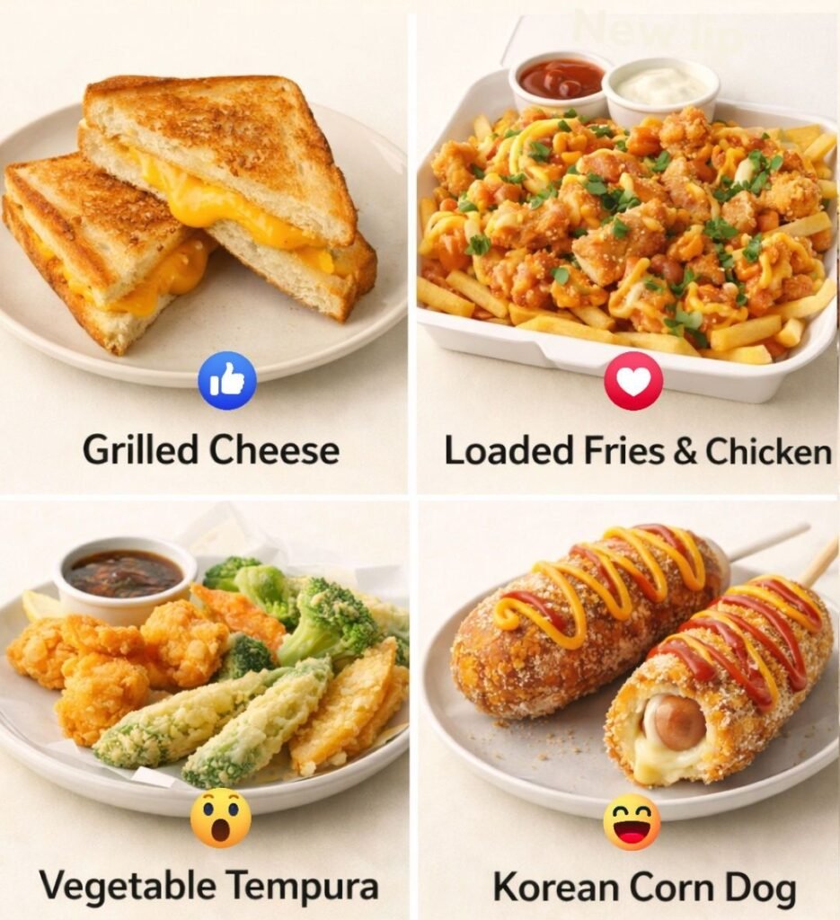 Here are full recipes for all four foods 👇🍽️ 🧀 Grilled Cheese Sandwich Ingredients (2 sandwiches) 4 slices bread (white,