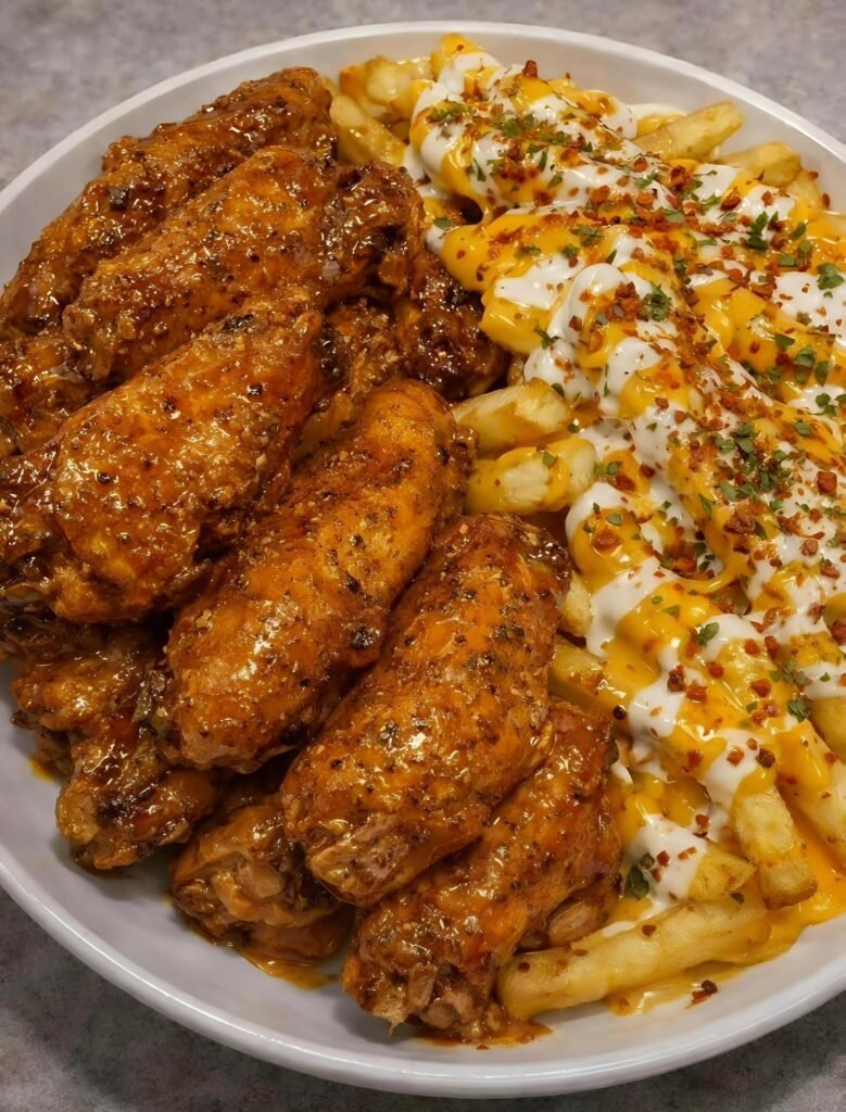 Honey Garlic Chicken Wings with Loaded Cheese Fries 🍗🍟Here’s the full recipe so you can make it at home. 🍗