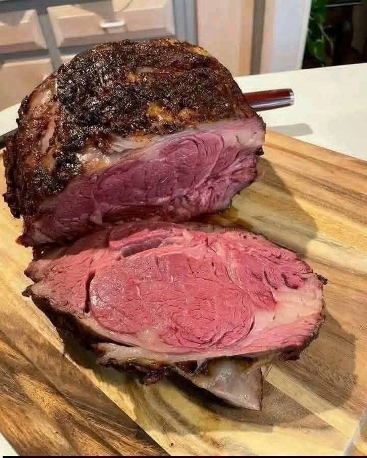 bone-in prime rib roast (standing rib roast) cooked medium-rare. Here is a full recipe to make it like this. 🍖🔥