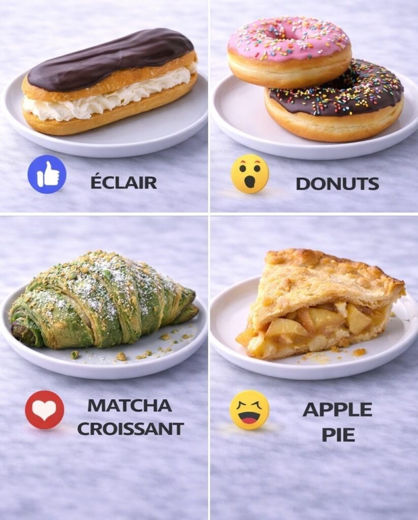 Here are full, easy-to-follow recipes for Apple Pie, Matcha Croissant, Donuts, and Éclair 🍎🥐🍩🍫 🥧 Apple Pie (Classic Homemade) 📝