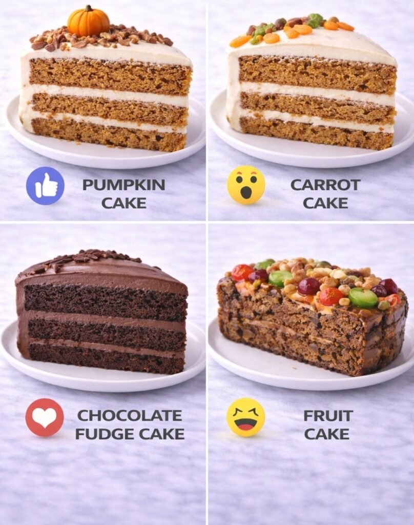 Here are full homemade recipes for all four cakes 🎂✨ 🎃 Pumpkin Cake (with Cream Cheese Frosting) 📝 Ingredients Cake: