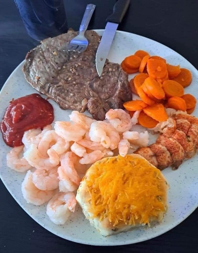 Here’s a full recipe:Garlic Butter Steak, Lobster Tail, Shrimp, Cheesy Mashed Potatoes & Carrots 🥩 Garlic Butter Steak Ingredients 1