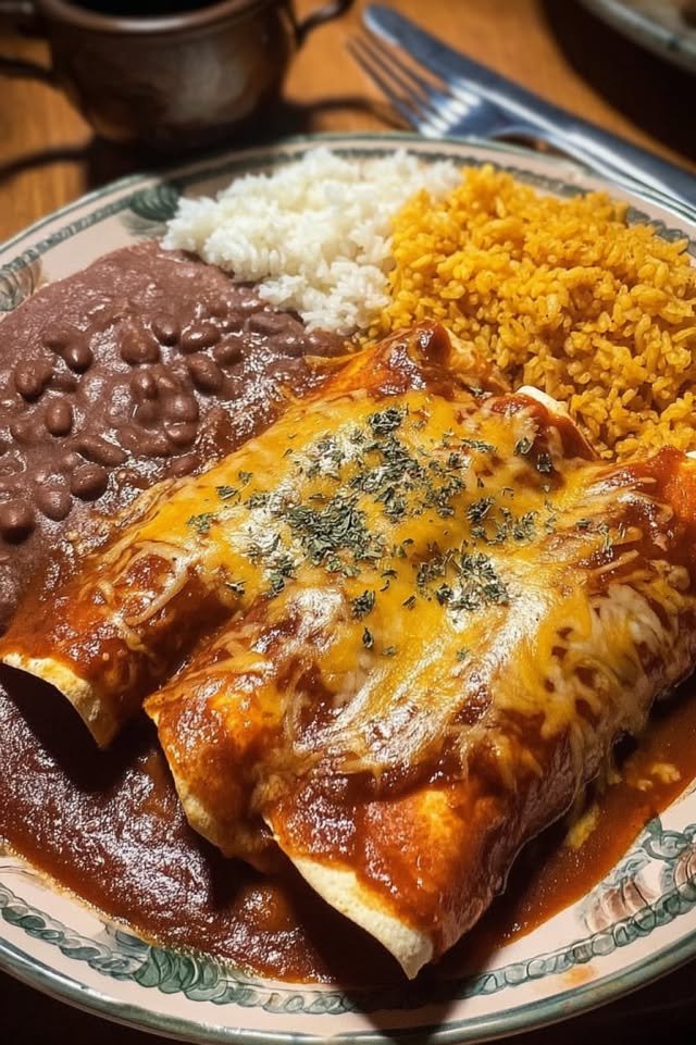 🌶🧀 Cheese Enchiladas with Chile Con Carne Sauce A classic Tex-Mex favorite — soft corn tortillas stuffed with cheese and