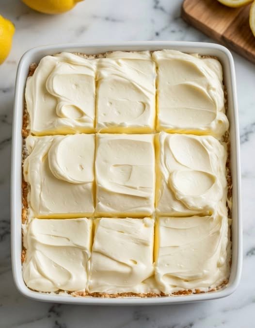 no-bake lemon cream dessert (lemon lush / lemon cream bars style) with a creamy topping and crumb crust. Here’s an