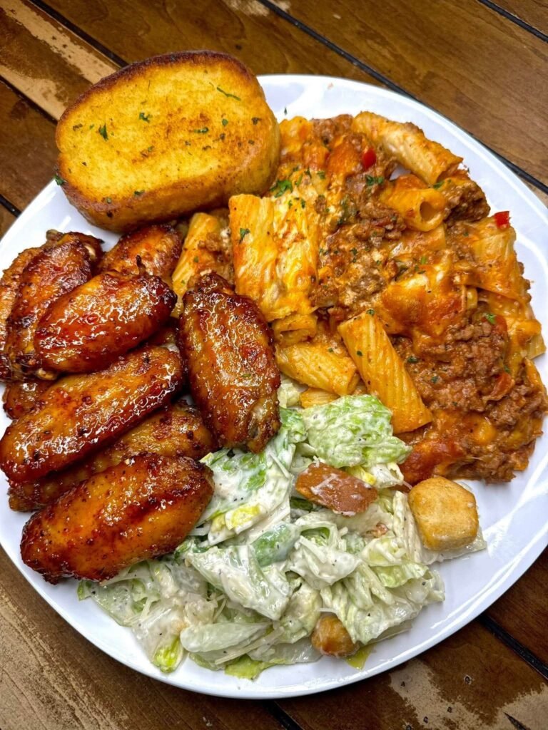 BBQ glazed chicken wings, baked cheesy beef pasta (rigatoni-style), garlic bread, and creamy Caesar salad. Here’s the full meal recipe