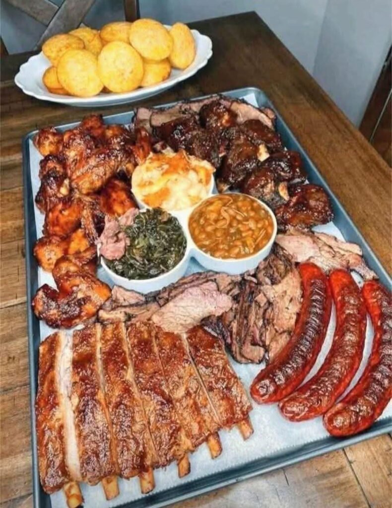 a BBQ Party Platter with ribs, sausage, brisket, chicken wings, baked beans, greens, mac & cheese, and cornbread! Here’s a