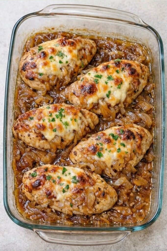 French Onion Chicken Bake — juicy chicken breasts baked over caramelized onions and topped with melted cheese. Here’s a simple,