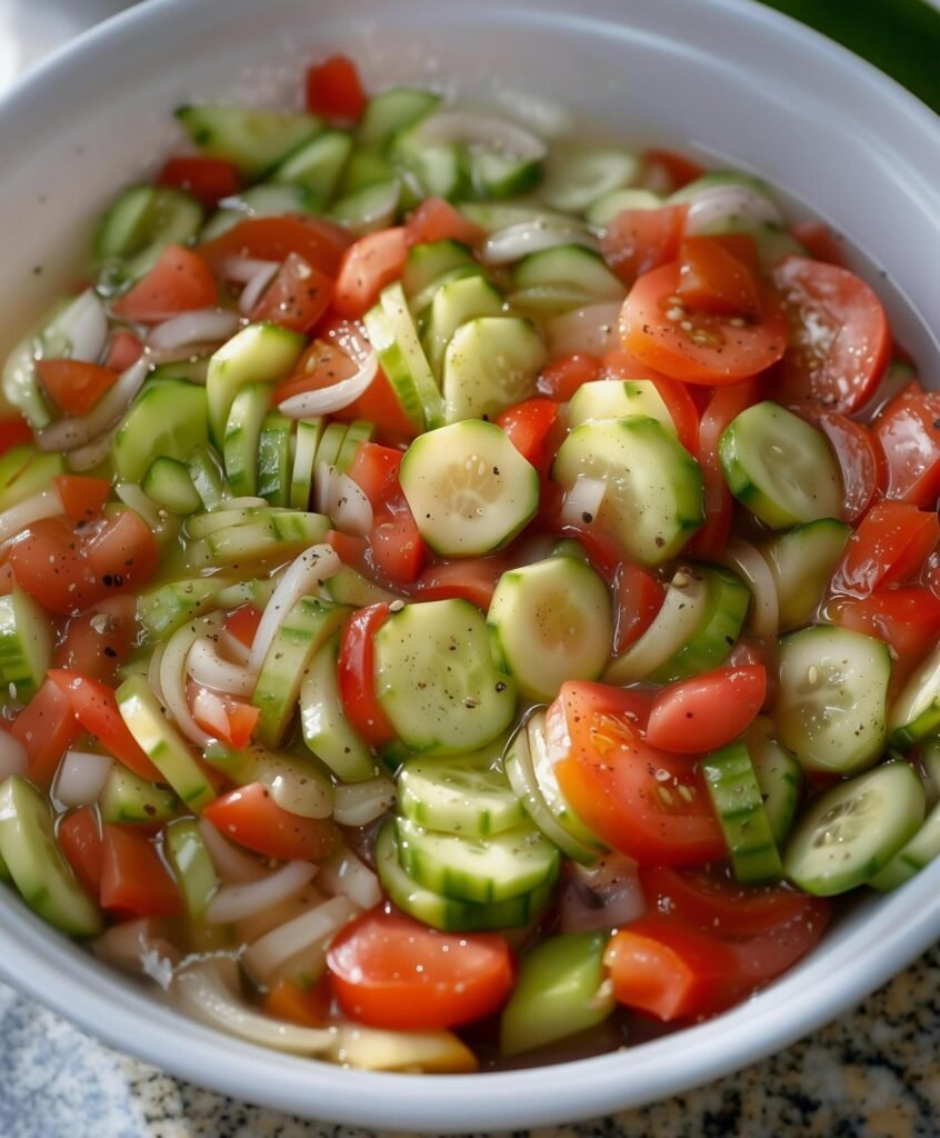 a cucumber tomato onion salad in a light vinaigrette — super fresh, simple, and perfect as a side dish. Here’s