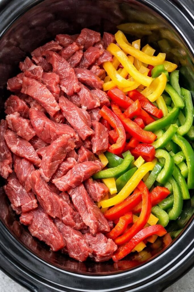 slow cooker pepper steak — tender beef strips with colorful bell peppers in a savory sauce. Here’s a simple, flavorful
