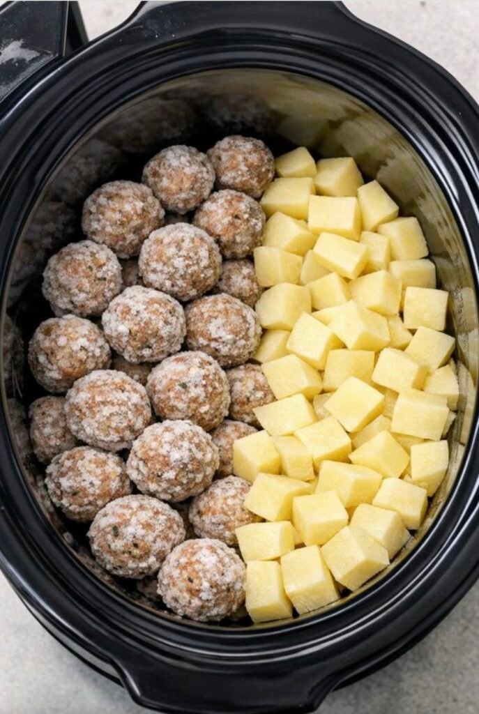 🥔🍖 Crockpot Meatballs & Potatoes 📝 Ingredients 1 (24–32 oz) bag frozen fully cooked meatballs 1½–2 lbs baby potatoes (halved