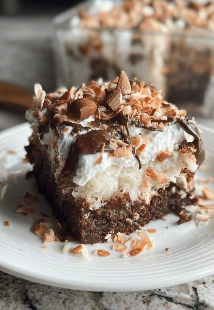 Here’s a rich, crowd-pleasing Almond Joy Poke Cake inspired by the classic flavors of the Almond Joy candy bar —