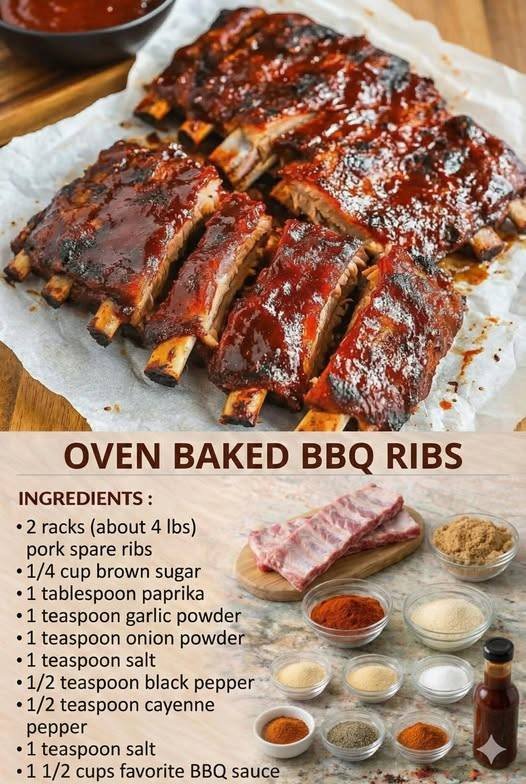 Oven-Baked BBQ Ribs (Tender & Saucy) Ingredients 2 racks pork ribs (baby back or spare ribs) Salt & black pepper
