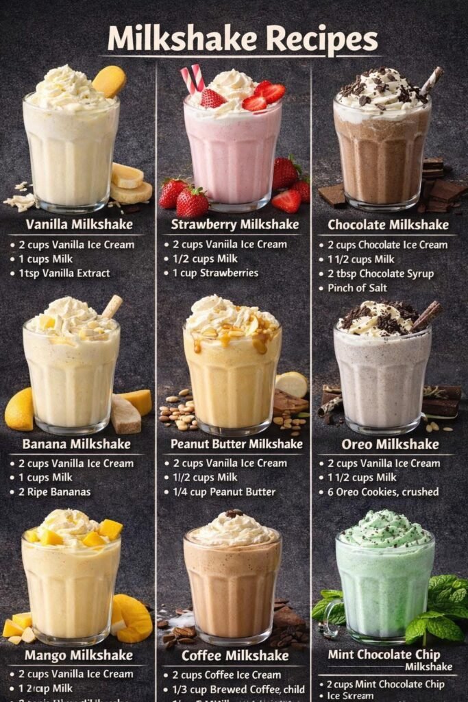 Vanilla Milkshake 2 cups vanilla ice cream 1 cup milk 1 tsp vanilla extract Strawberry Milkshake 2 cups vanilla ice […]